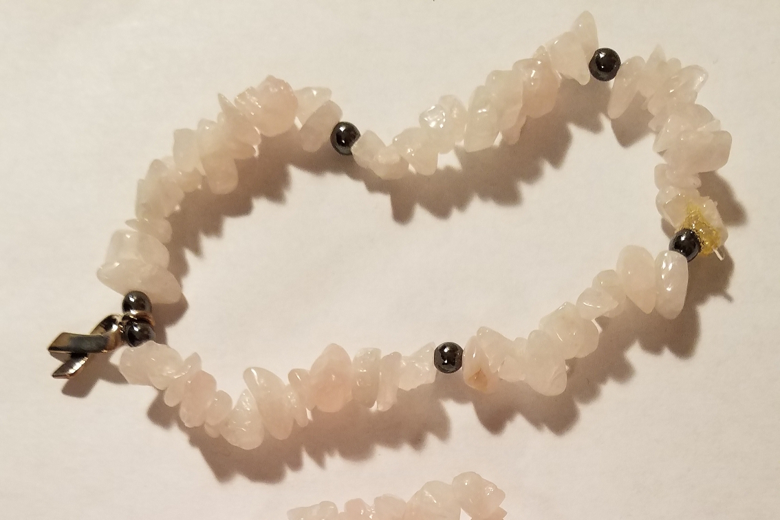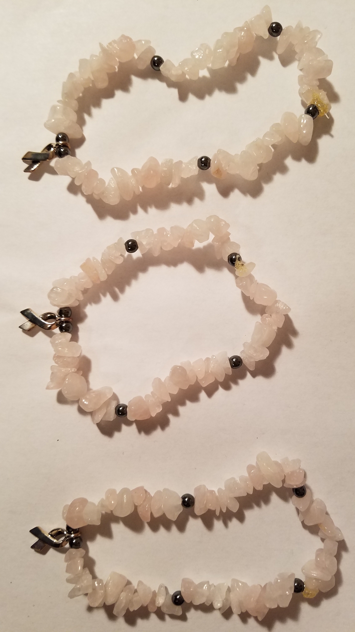 Rose Quartz Chip Stones with Awareness Ribbon Bracelet by Nsoroma Designs. Accented with hematite beads and ribbon charm. Stretch Bracelet. Fits most adult wrists. Approximately 7 inches.