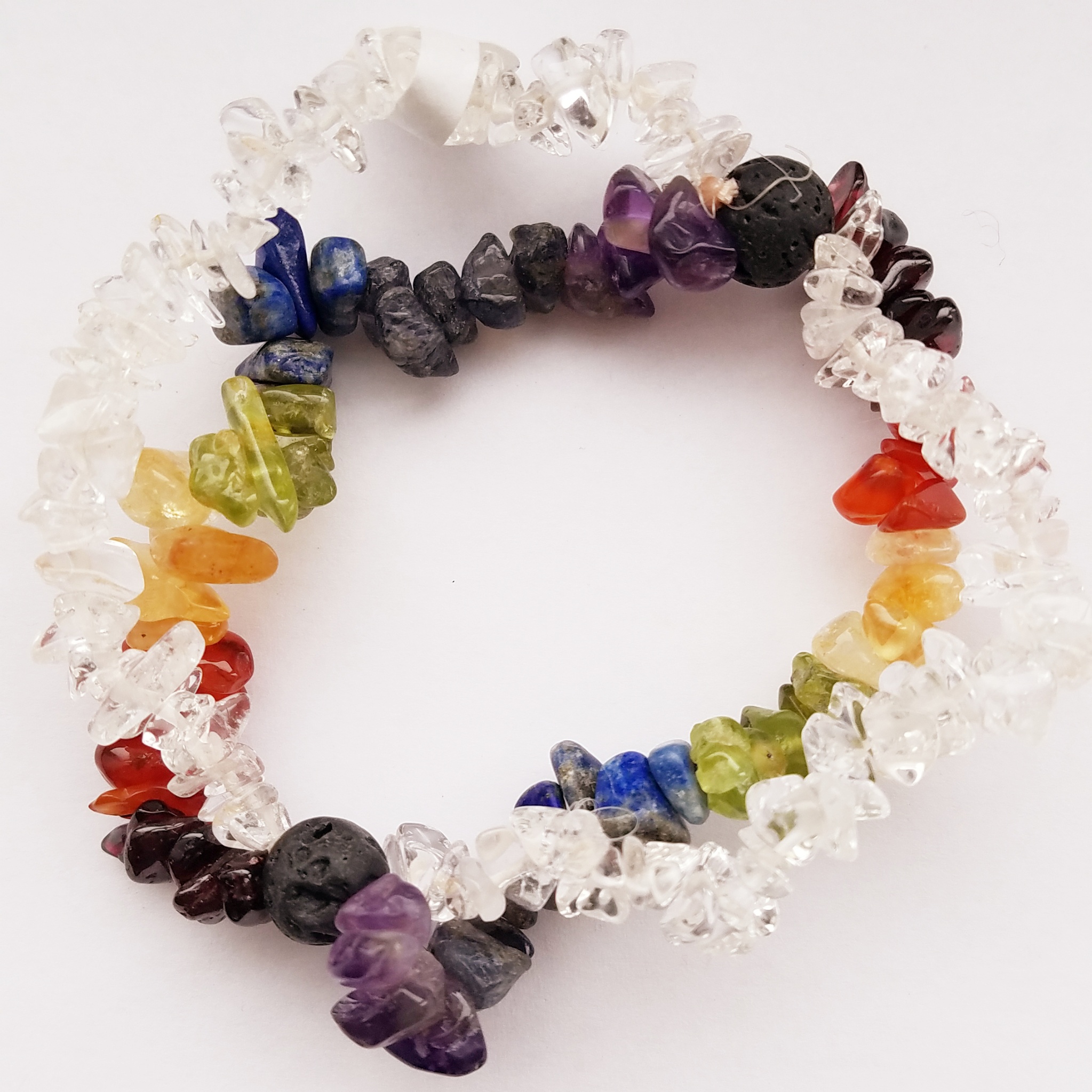 Unique Combo. Chakra Quartz Chip Stone Bracelet secured with lava beads at each end.