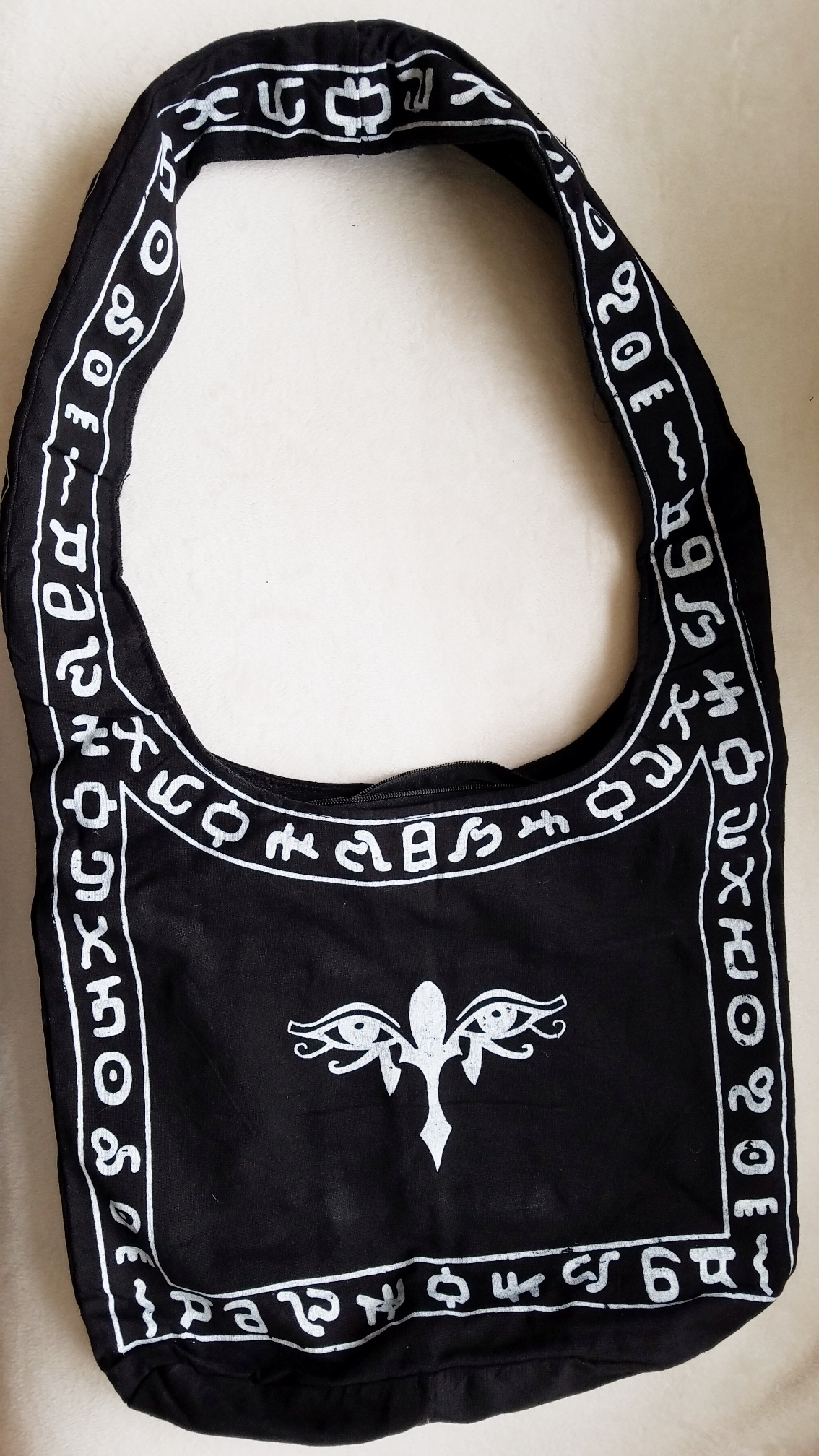 Black & white hobo bag with Eye of Horus and ancient inspired symbols on front and back of bag. Made of cotton twill. Zippered closure. Approximately 30" long x 15" wide x 5" depth.