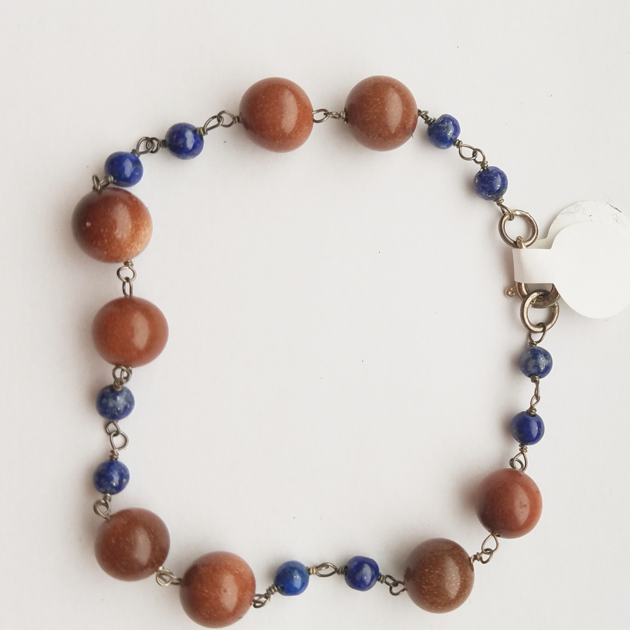 Genuine Stones Lapis Lazulis and Sunstones Bracelet with 925 sterling silver. Spring ring clasp. Length 7.75 inches.