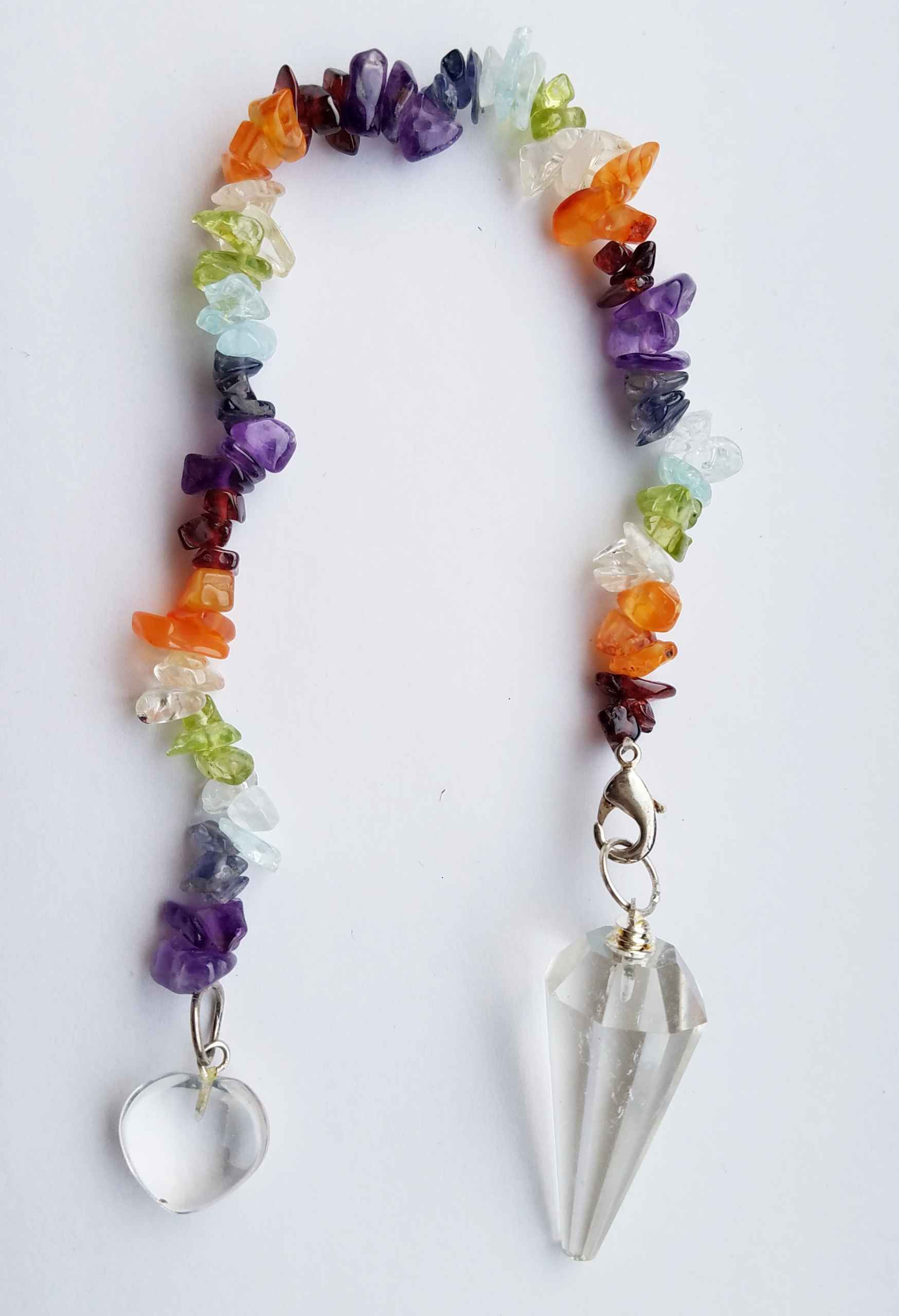 Quartz Pendulum features chakra chip stones and crystal quartz heart-shaped accent.