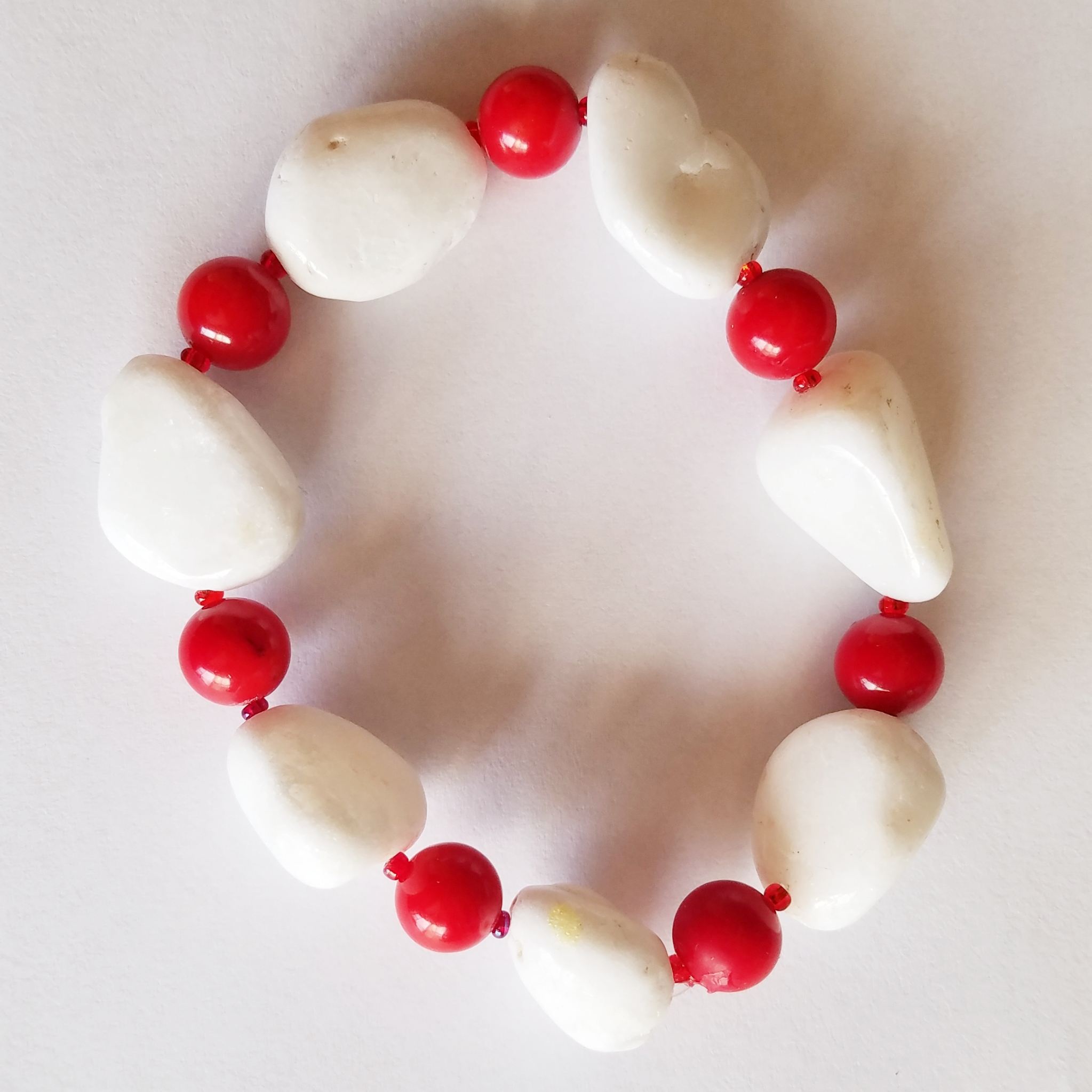 Red Coral and Quartzite Bracelet by Nsoroma Designs. Stretch bracelet. One size fits most adults. Approximately 7 inches.